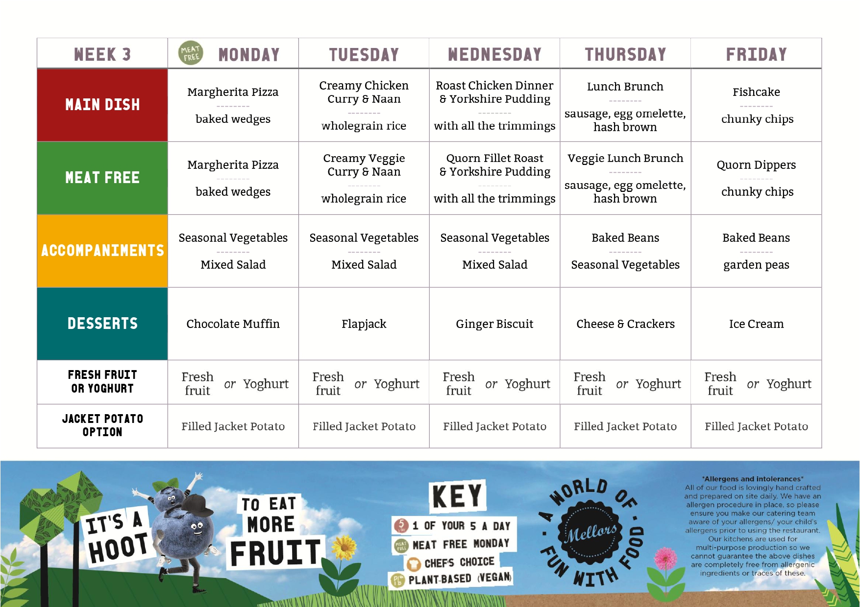 Parents can either book a school meal for their child/ren or provide a packed lunch. We have three weekly menus that are rotated throughout the term. Please see the menus and rotation dates below.