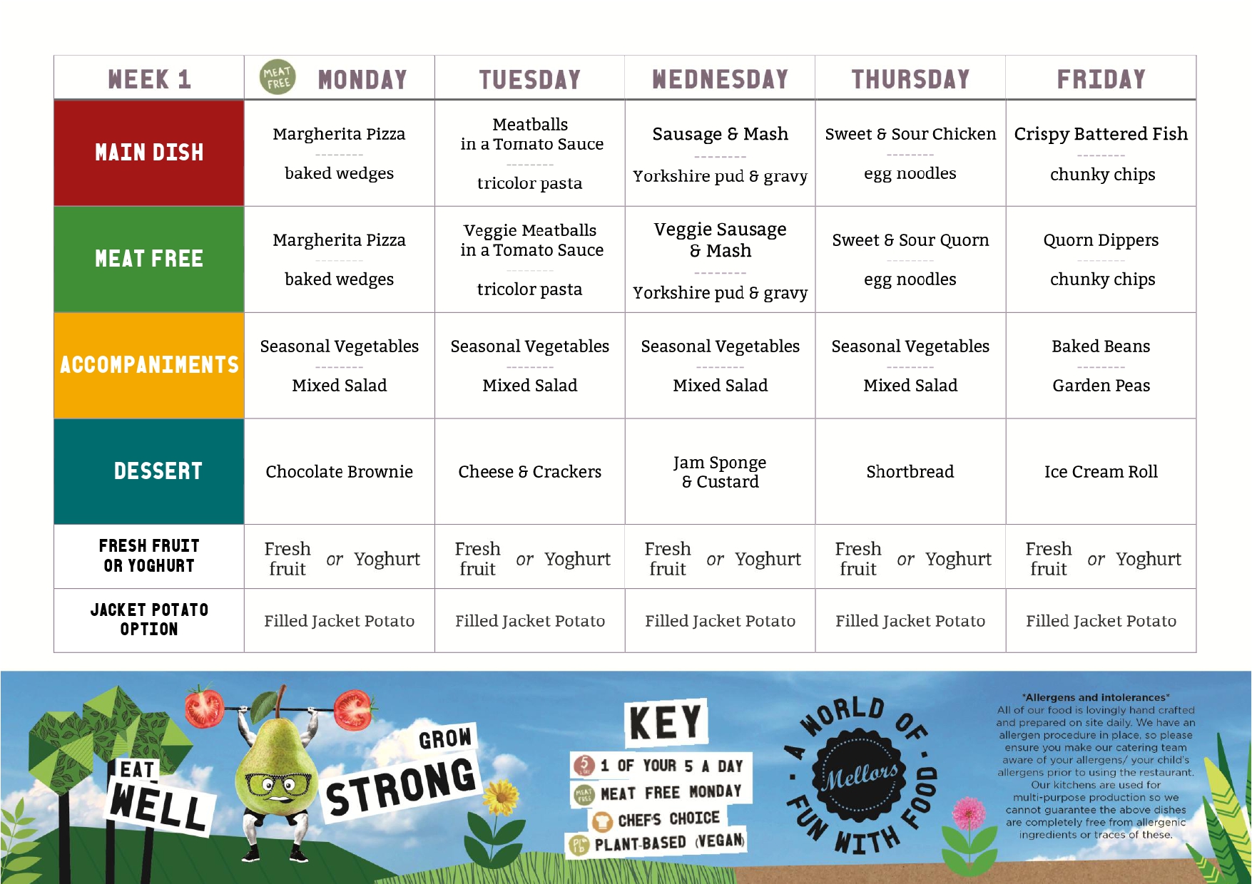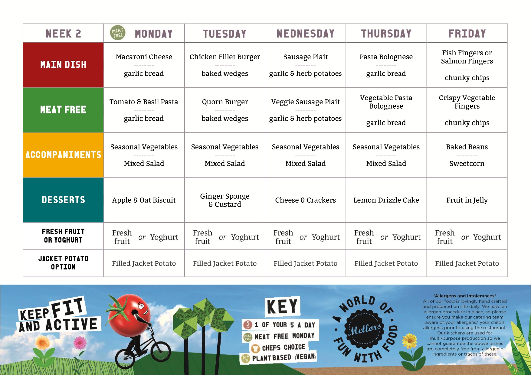 Our school uses Mellors Catering Services to provide delicious food to our children. All food is cooked onsite in our well equipped kitchen. Mellors is committed to delivering an exciting choice of food where the finest, freshest ingredients from local suppliers are used which means better quality food. Meals are eaten in the school hall and children are overseen by our MSAs (Midday Supervisory Assistants)